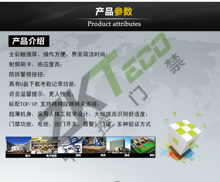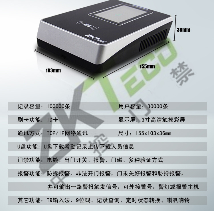 報警功能:防拆報警,非法開門報警,門未關好報警和脅持報警,并可輸出一路警報觸發(fā)信號,可外接警號,警燈或報警主機