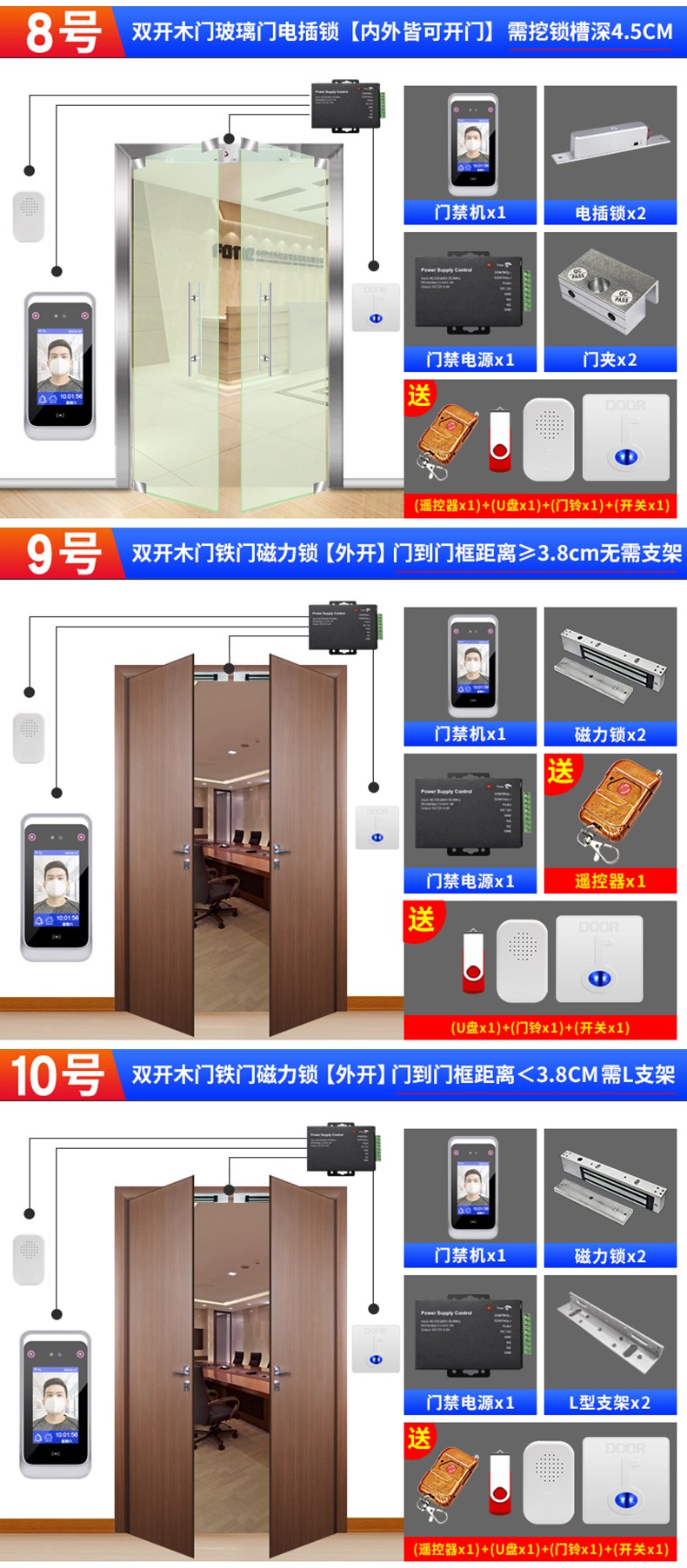 動態(tài)人臉識別考勤門禁一體機(jī) 面部簽到打卡機(jī) 門禁系統(tǒng)套裝辦公室木門鐵門玻璃門磁力鎖電插鎖