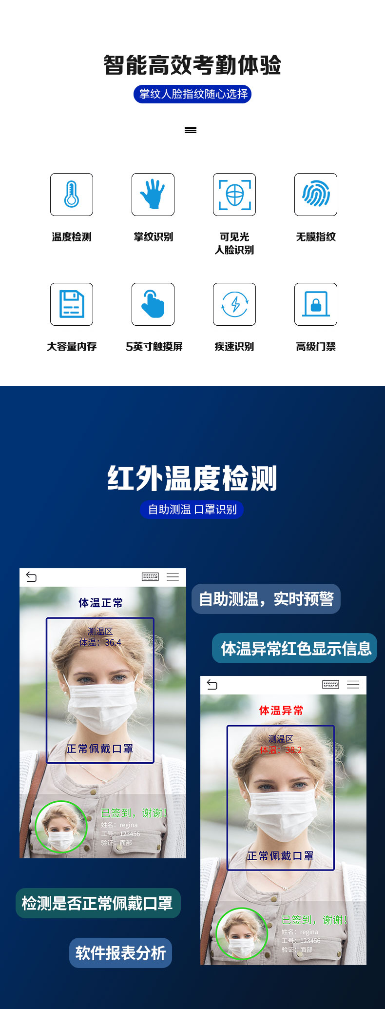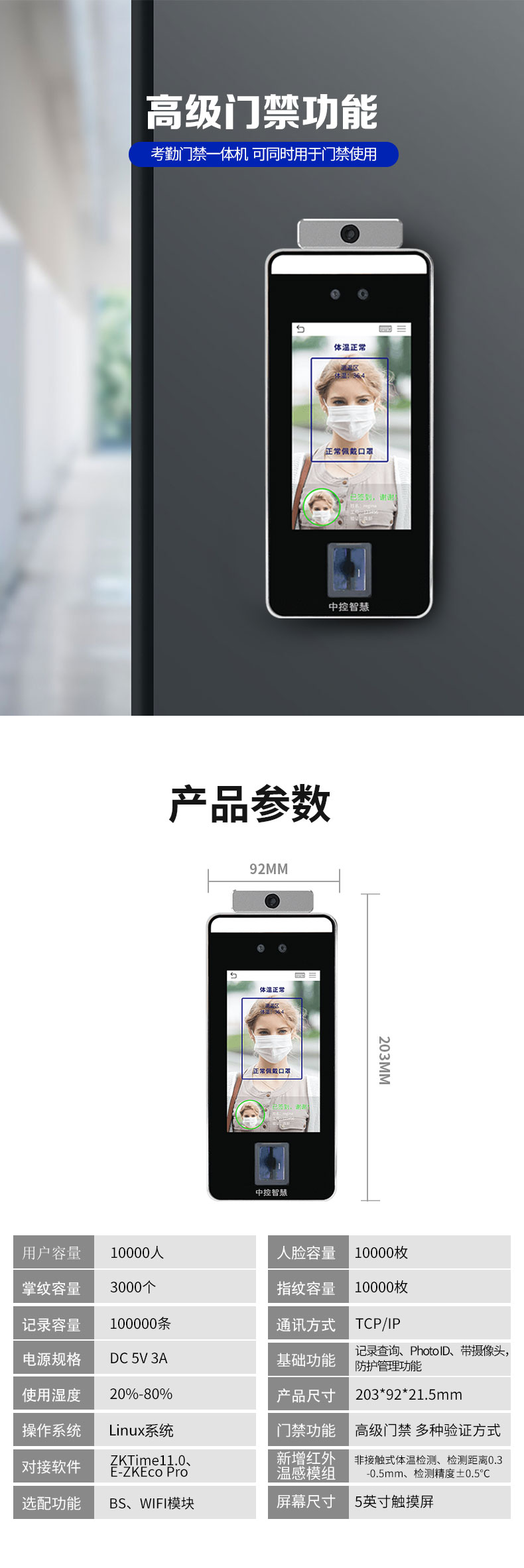 非接觸式掌紋門禁xface600plus是一款測溫門禁智能終端,搭載測溫模塊;選配WiFi導(dǎo)數(shù)據(jù) 非接觸式掌紋門禁xface600plus系列基于熵基科技深度學(xué)習(xí)算法,通過對人的掌紋或臉部、指紋特征信息實現(xiàn)快速身份識別,讓人們享受到更加安全、便捷、高效的通行體驗,推出的非接觸式混合生物識別終端。xFace600-Plus還搭載高性能紅外體溫檢測模塊,人員通行時即時檢測人表體溫并報警,提供更為安全、便捷、高效的通行體驗。另外,xFace600-Plus廣泛適用于社區(qū)、校園、醫(yī)院、景區(qū)、酒店、商場、寫字樓、公共服務(wù)場所等場景。